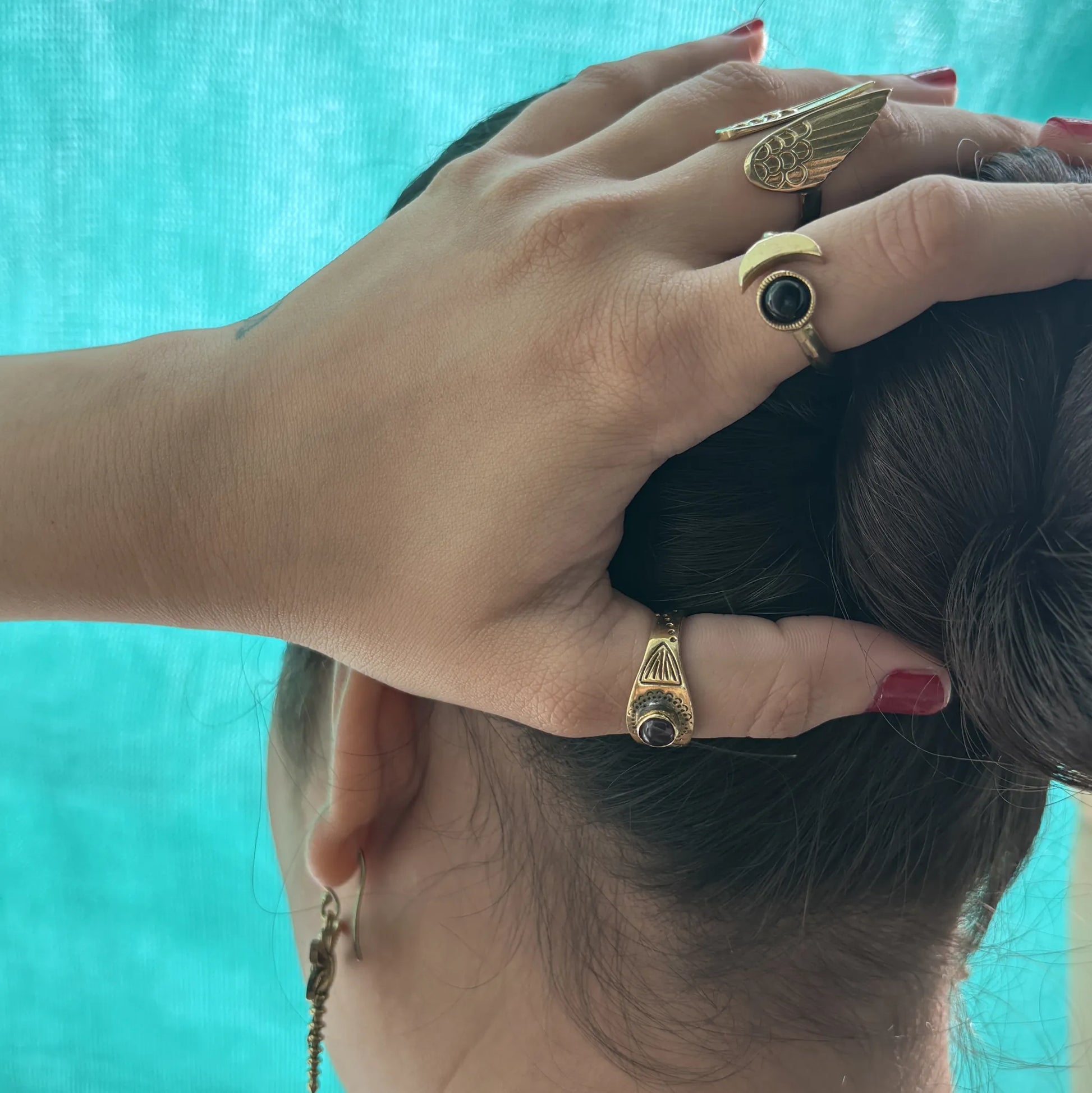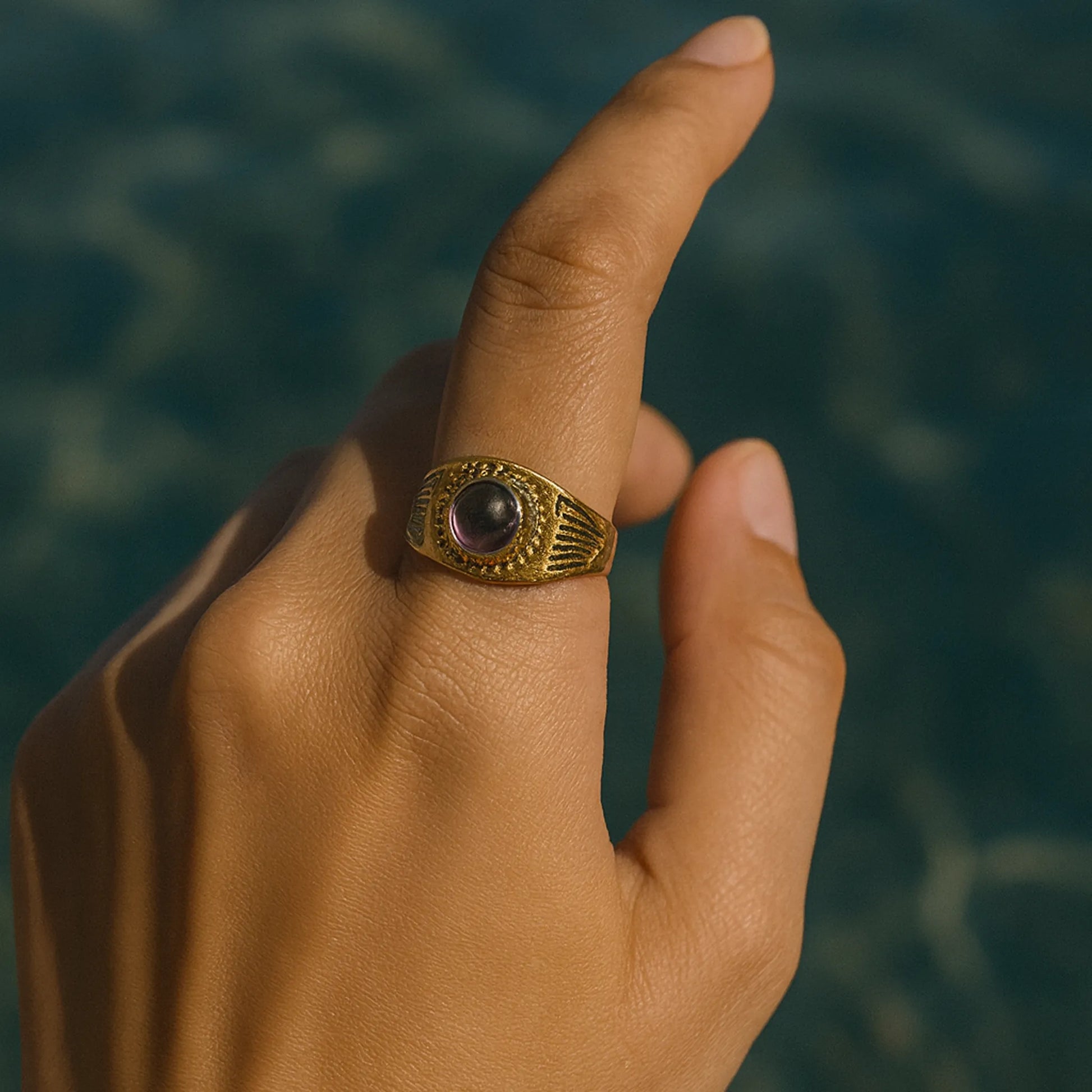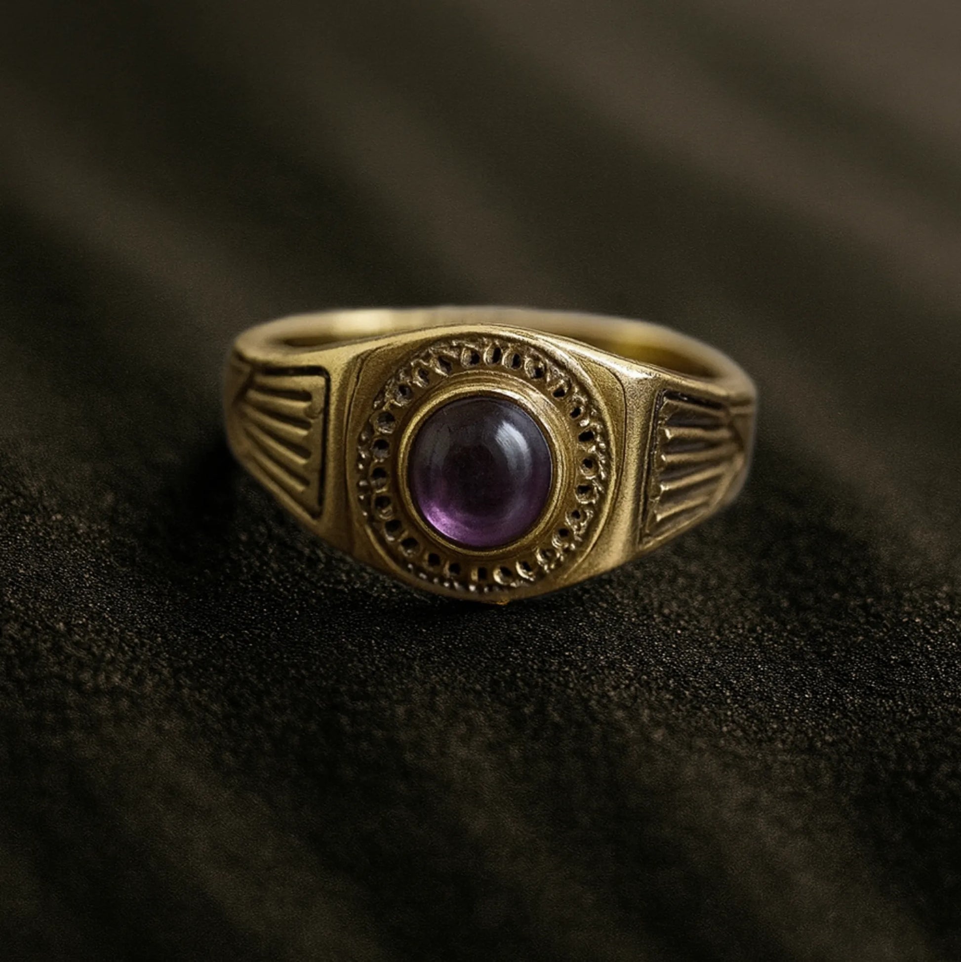 A polished amethyst sits in a sleek brass bezel, bringing calm energy with a modern finish. Perfect on its own for a soft pop of color or stacked with gold-toned bands for a layered statement. Pairs beautifully with neutrals or earthy tones in your wardrobe.