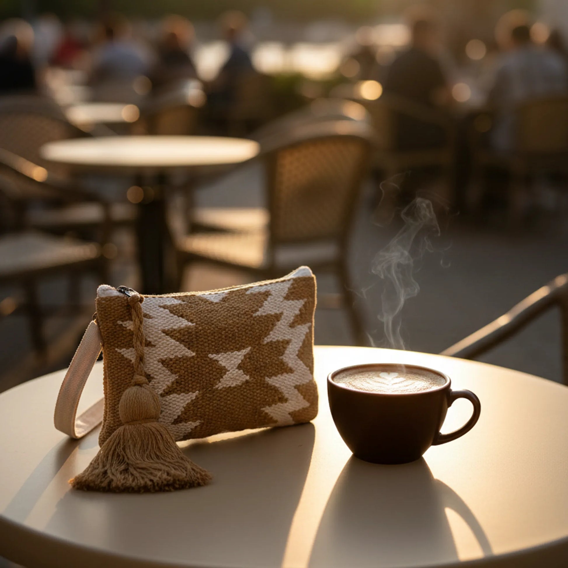A textured handloom cotton wristlet bag featuring a bold zigzag geometric weave in warm amber and ivory tones. Designed with a comfortable wrist strap for easy carry, this bag blends earthy charm with everyday utility. Soft, durable, and beautifully woven perfect for minimal, on-the-go style.